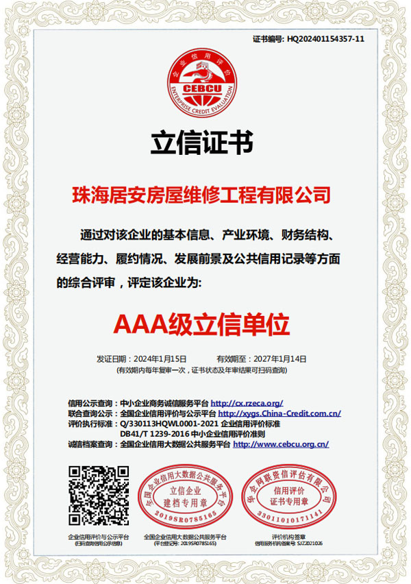 珠海居安房屋維修工程有限公司成立于2020年,是一家專注房屋維修的公司。我們擁有各類型專業(yè)人才,業(yè)務(wù)包括老舊建筑翻新改造、外墻空鼓修復(fù)、防水幕墻養(yǎng)護、外墻預(yù)置構(gòu)件拆除更換、供排水管網(wǎng)改造、墻面翻新、鋼制結(jié)構(gòu)建筑構(gòu)建及折除,外墻清洗及裝修裝飾。 公司自成立以來,始終堅持以人為本、誠信敬業(yè)的經(jīng)營原則,與多家單位達成固定維修、養(yǎng)護清洗協(xié)儀,業(yè)務(wù)遍及廣州、東莞、中山、珠海等多個周邊城市。專業(yè)化團隊尤其在墻面及窗邊防水工程業(yè)內(nèi)知名。…… >>> 更多內(nèi)容 |